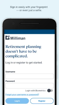 Security is No. 1. This app uses multi-factor and biometric authentication to keep your account information secure. Log in with the same username and password that you use for MillimanBenefits.com. If you have not set up your Security Questions/Answers or accepted the Online Access Agreement, you will be prompted to do so in the app or you can visit MillimanBenefits.com to complete your account registration.