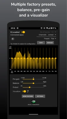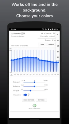 Listening to music at a too high volume for a too long time may damage your hearing. Be especially careful when using earphones with this equaliser. Also beware that your device or speakers may be damaged by loud sounds. This app is provided 'as is' without any kind of warranty, and you may use it at your own risk.